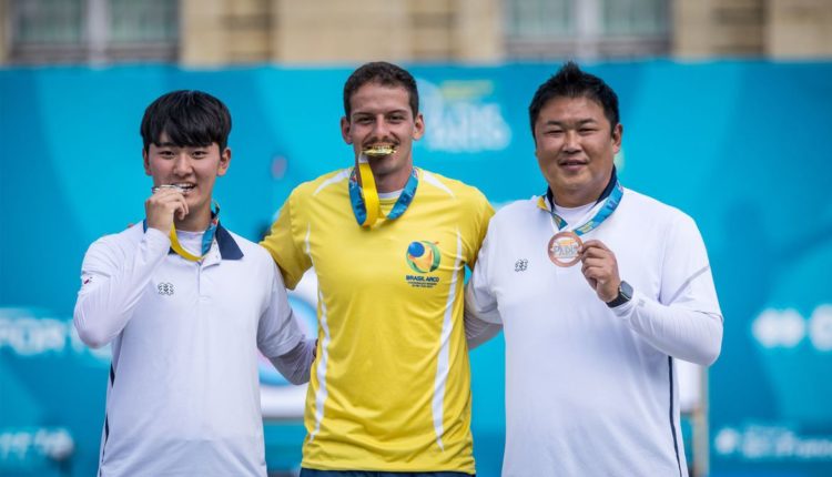 O brasileiro Marcus D’Almeida, número seis no ranking mundial,  conquistou neste domingo (26), pela primeira vez na carreira, a medalha de ouro em uma etapa da Copa do Mundo de Tiro com Arco. O carioca, de 24 anos, venceu de virada, por 6 a 5, o sul-coreano sul-coreano Kim Je Deok – duas vezes ouro na Olimpíada de Tóquio (Japão) ano passado – nesta manhã em Paris (França).