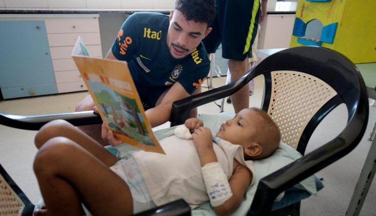 Mais tímido, o pequeno Heitor estava um pouco desconfiado com a visita. Mas um gesto simples de Daniel Cabral conseguiu tirar um sorriso do menino de cinco anos. O meia da Seleção pegou uma cadeira, um livro e sentou-se ao lado dele para ler uma história. Depois, emprestou seu celular para que ele visse um desenho.