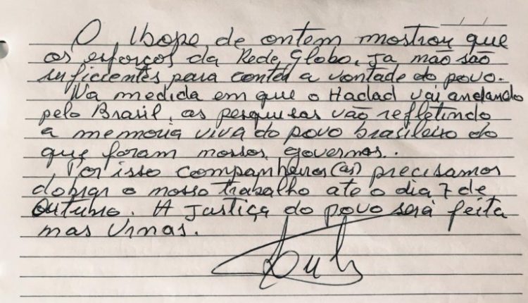 Ex-presidente divulgou nesta quarta-feira (19) um bilhete de próprio punho onde diz que a Ibope mostrou que a Globo não consegue calar o povo