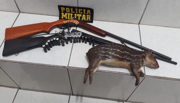 Os PMs faziam rondas na área rural quando flagraram a dupla em uma moto carregando um paca abatida e duas espingardas.