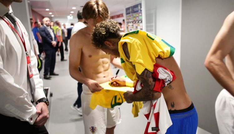 Neymar e Modric trocam camisas, assinaturas e abraços