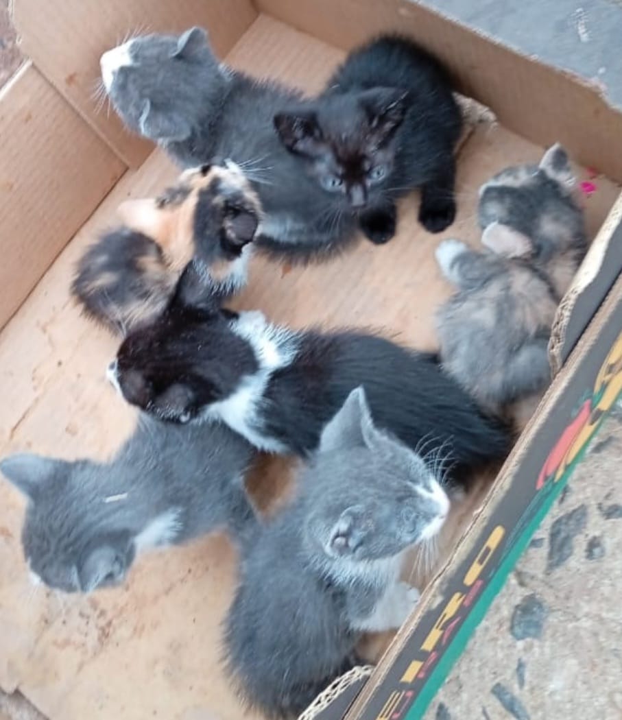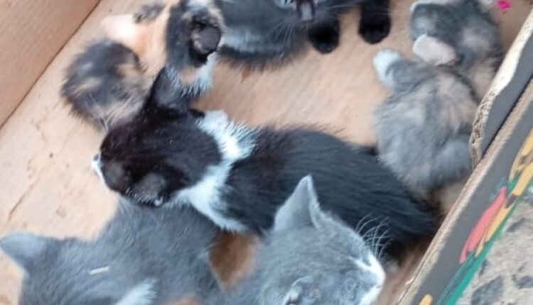 Dentro da caixa estavam sete gatinhos, resgatados horas depois. São os que ilustram a capa dessa matéria.