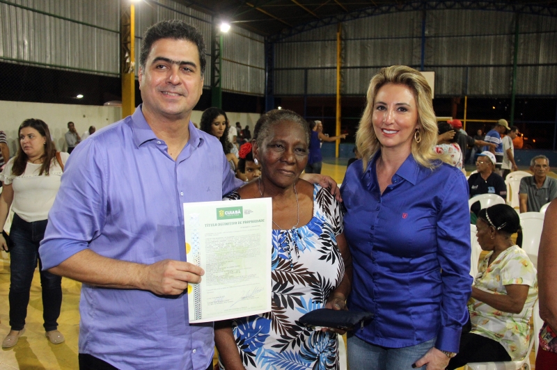 Andressa Sales – Para comemorar o aniversário de Cuiabá, neste 8 de abril, a Prefeitura programou a entrega, durante todo este mês, de mais de 700 títulos de regularização fundiária do programa “Meu Lar, Minha Conquista”. Na noite desta terça-feira (03), o prefeito Emanuel Pinheiro e a primeira-dama, Márcia Pinheiro entregaram 70 títulos de propriedade aos moradores dos bairros Praeiro, Praeirinho e Jardim Paulista. O evento foi realizado na quadra da Escola Municipal de Ensino Básico (EMEB) Hélio Souza de Vieira e reuniu a comunidade.