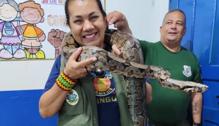 Muita gente não teria coragem de colocar uma jiboia no pescoço. Mas a técnica fez isso de maneira tranquila e até elegante.