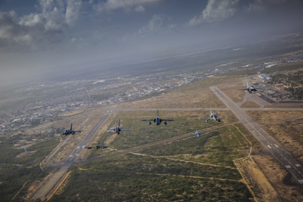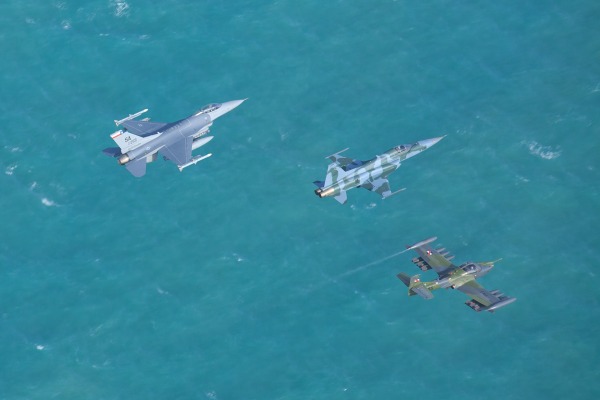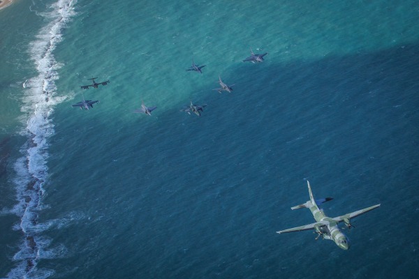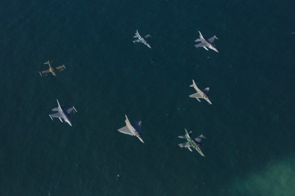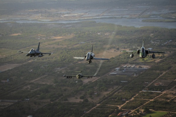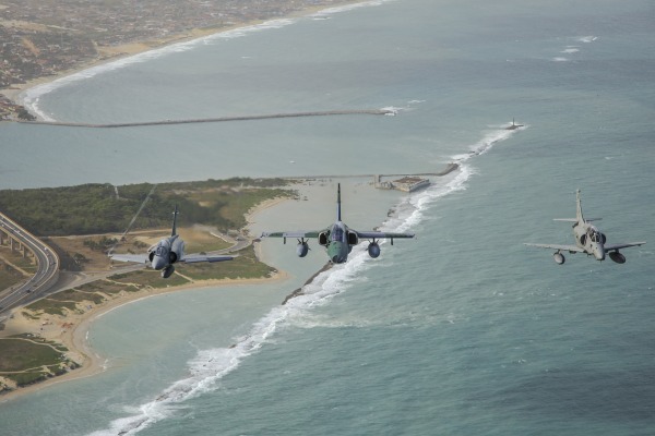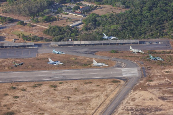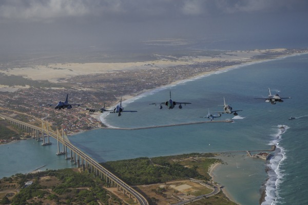 Os caças estão participando do exercício. A formação foi composta por um A-1M, um F-5M e um A-4, todos brasileiros; dois F-16 – um chileno e um norte-americano; um A-37 uruguaio e um Mirage 2000 peruano.