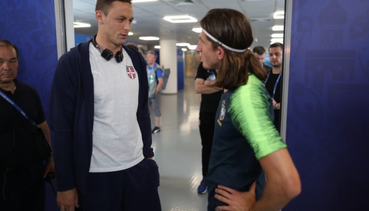O treino da Seleção Brasileira recém havia acabado quando a Sérvia começou a chegar ao palco do jogo do dia seguinte. Neste momento, Willian e Filipe Luís pararam conversando com Matic e Ivanovic.